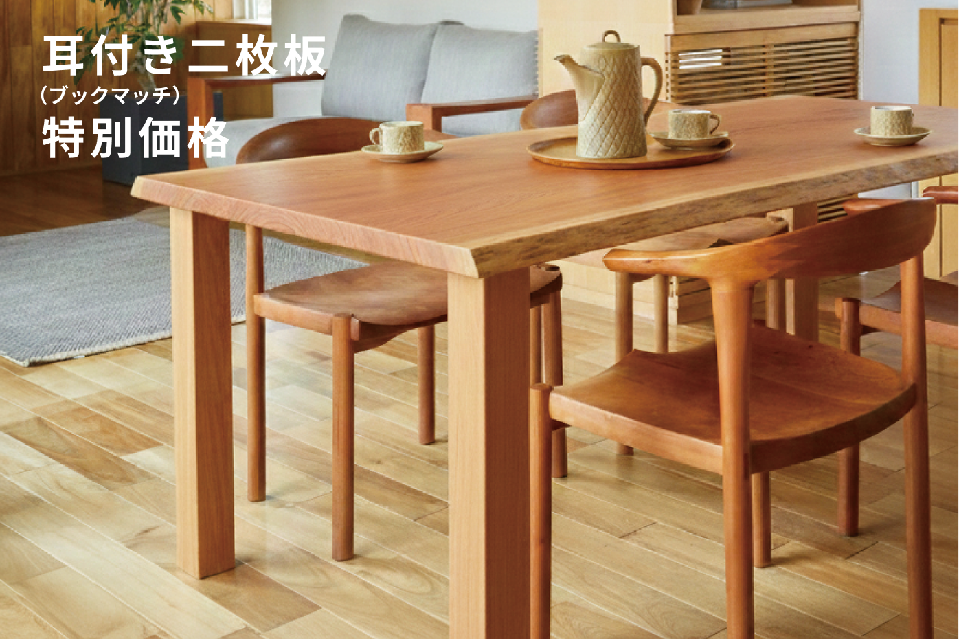 一枚の原木から挽いた板を左右に開き、木目を鏡写しのように合わせた特別な天板です。